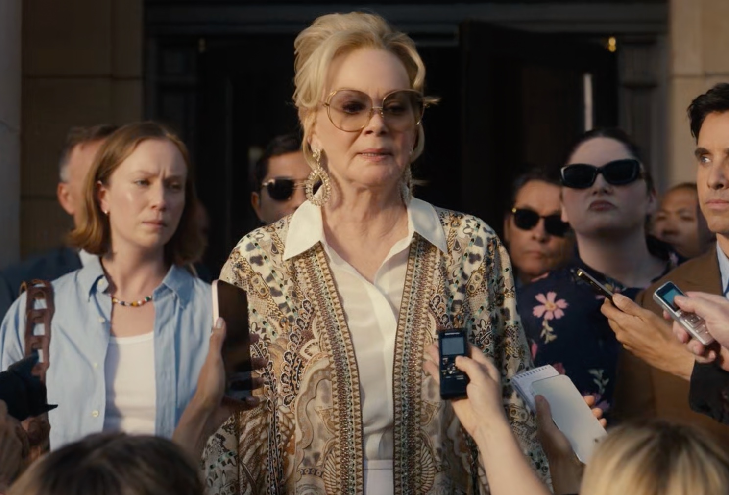 The expansion of the supporting cast provides a satirical look at the unhinged corporate infrastructure of Hollywood in 2026. Paul W. Downs as the perpetually stressed agent Jimmy and Meg Stalter as the hilariously incompetent nepotism baby Kayla have essentially become the stars of their own chaotic spin-off operating in the margins. The premiere features a stressful extended sequence where Jimmy and Kayla frantically navigate a massive corporate merger between a legacy streaming service and a tech conglomerate run by predictive AI algorithms. Stalter’s unmatched improvisational energy provides a necessary contrast to the existential dread permeating Deborah’s storyline. The production design for the talent agency offices—featuring transparent, soundproof glass walls—serves as a heavy-handed but effective visual metaphor for an industry that demands total visibility while offering zero genuine human connection. Everyone can see everyone else drowning, but the glass is too thick to actually help.